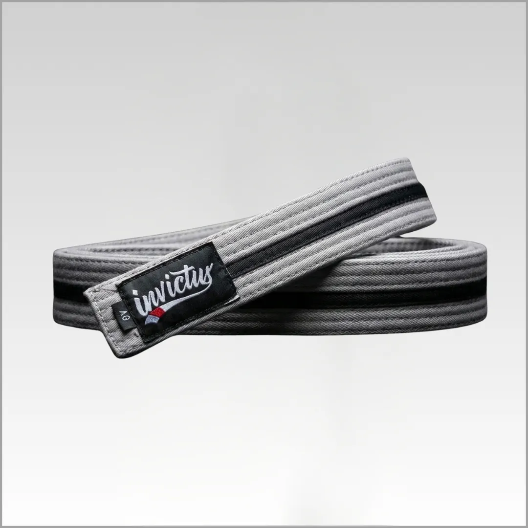 Faixa de Jiu Jitsu Cinza com listra Preta. Feitas de sarja 100% algodão, borracha EVA vulcanizada e contém 7 costuras.